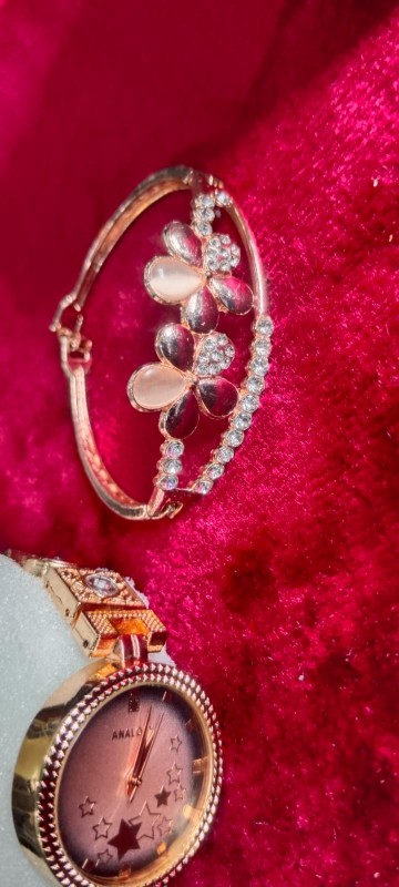 Elevate your style with this stunning gold analog watch and bracelet set. The luxurious wristwatch features a sparkling display of brilliant stones and an enchanting cosmic star motif, seamlessly blending sophistication with celestial charm. Paired perfectly, the gold bracelet showcases a vibrant blue floral design, adding a touch of elegance and color to your wrist. Ideal for both special occasions and everyday glamour, this exclusive set makes an unforgettable gift. The watch dial measures approximately 34mm, with an adjustable chain for a comfortable fit, and both pieces shine in radiant gold with gleaming blue accents.
