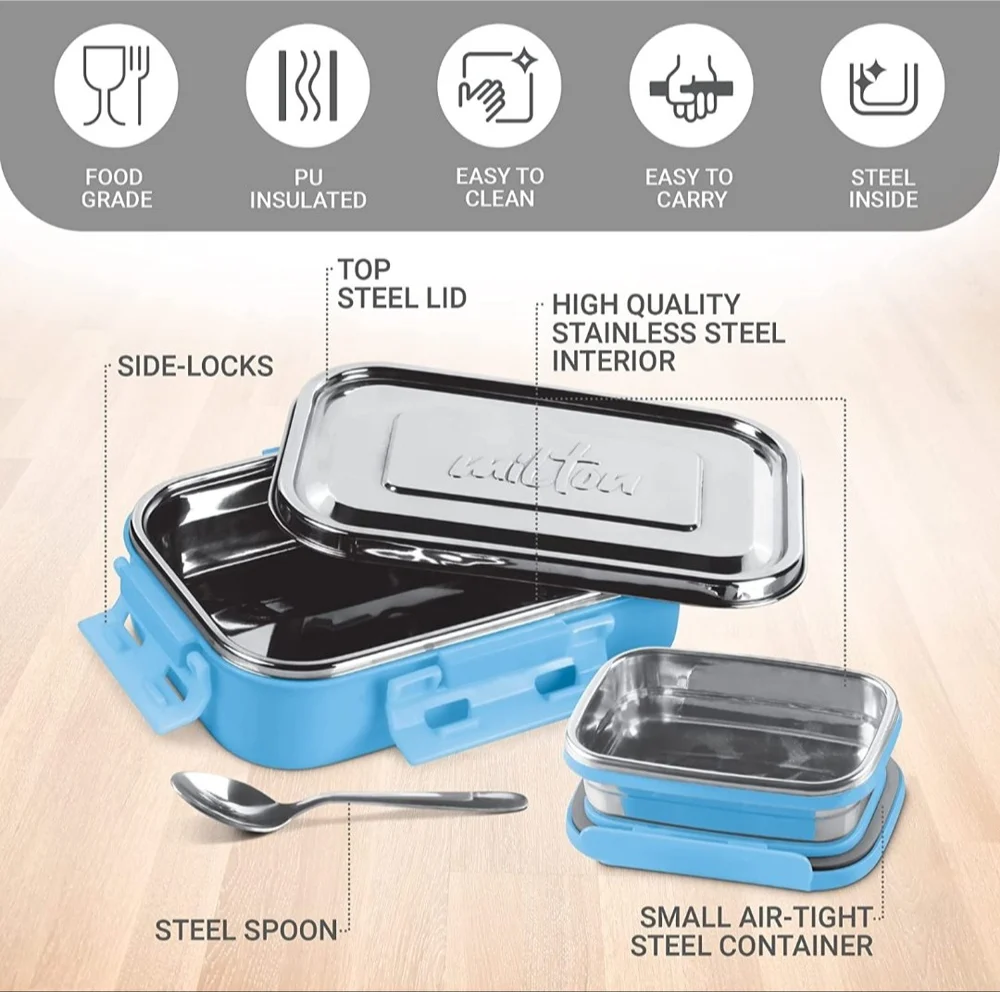 • A small airtight steel container inside with lid which is ideal for carrying gravy and curry and it contains a steel spoon. It vibrant and attractive prints, it is an ideal choice for your kids’ tiffin.
