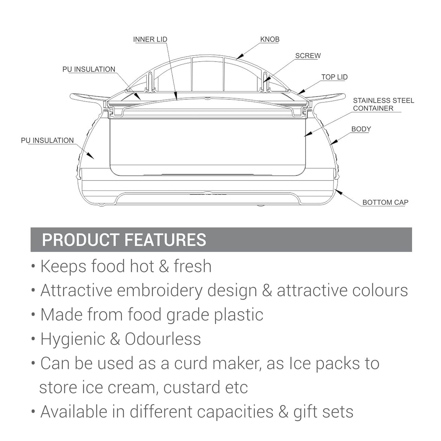 • Enhance the look of your dining table with its exclusive shape and design. It can be used for Salads, chapatti, Roti and it can also be used as a curd maker, as Ice-packs to store ice-cream, custard.