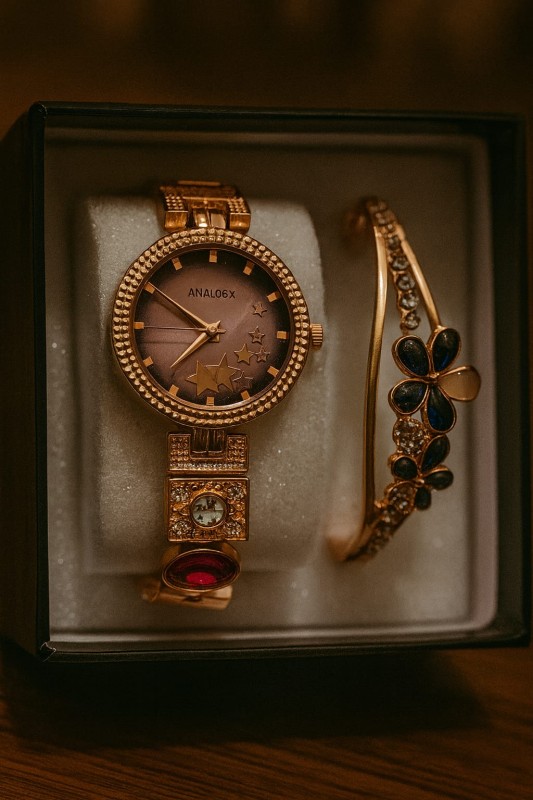 Elevate your style with this stunning gold analog watch and bracelet set. The luxurious wristwatch features a sparkling display of brilliant stones and an enchanting cosmic star motif, seamlessly blending sophistication with celestial charm. Paired perfectly, the gold bracelet showcases a vibrant blue floral design, adding a touch of elegance and color to your wrist. Ideal for both special occasions and everyday glamour, this exclusive set makes an unforgettable gift. The watch dial measures approximately 34mm, with an adjustable chain for a comfortable fit, and both pieces shine in radiant gold with gleaming blue accents.