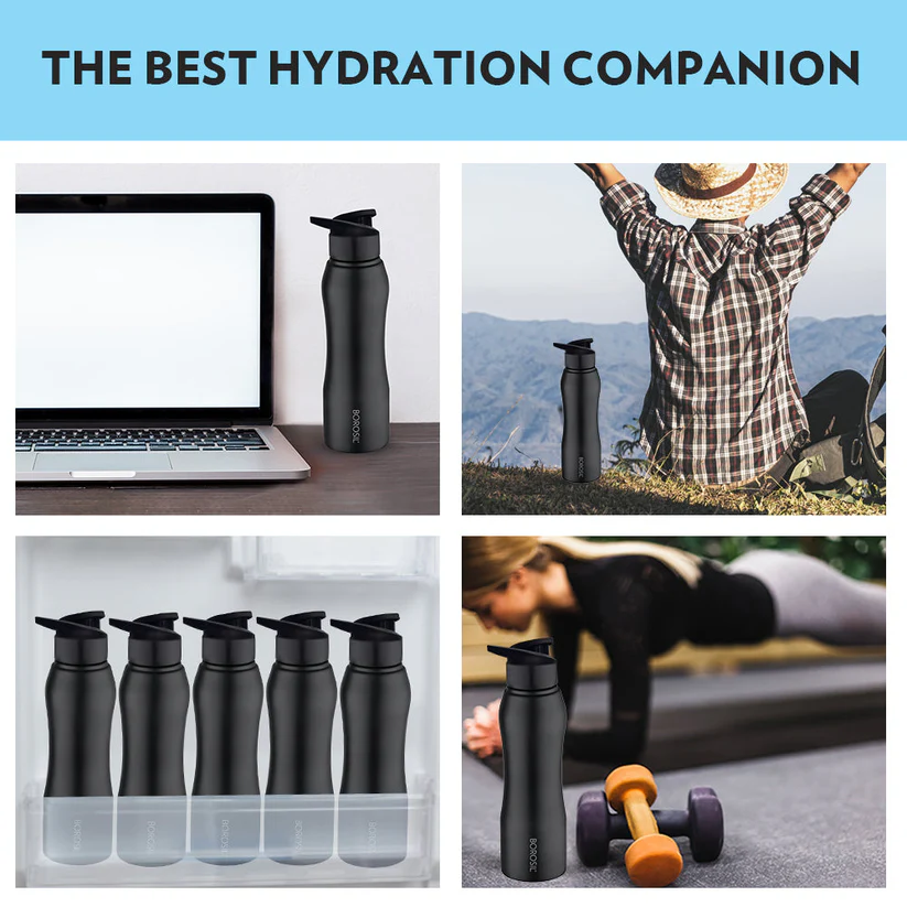 Convenient size fits in the side pocket of school, trekking or office bag, car bottle holder etcOdour free and leak proof and easy to pourFlip top lidSuitable for fridge useSuitable for cycling, camping, hiking and other outdoor sports