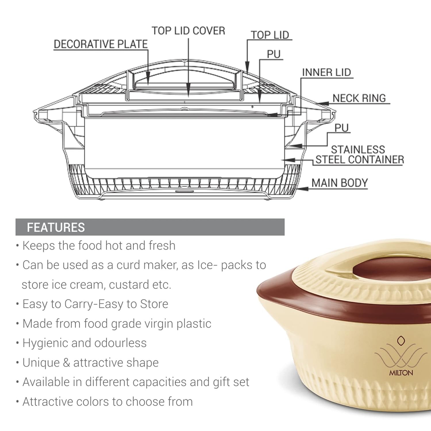 • Double walled Inner stainless steel casserole keeps food hot and fresh for hours. The refined pastel colours and the striking design elevates your dining décor and thus makes it a must-have casserole for your home.