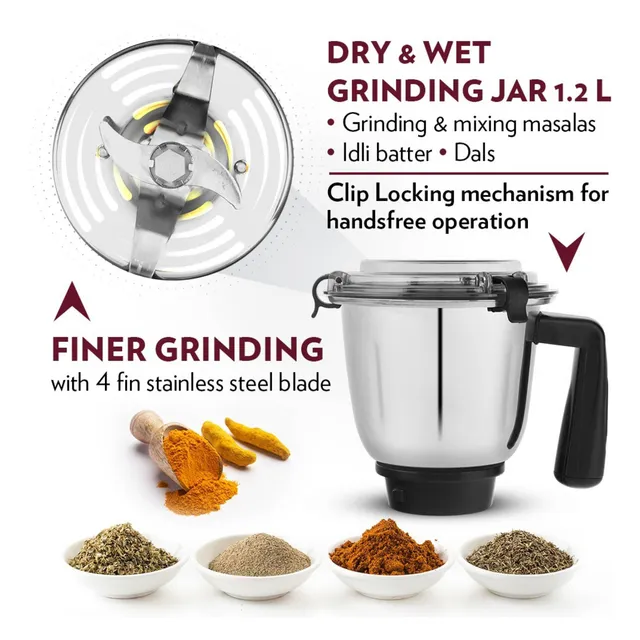 - 1.2 L dry / wet grinder with clip locking